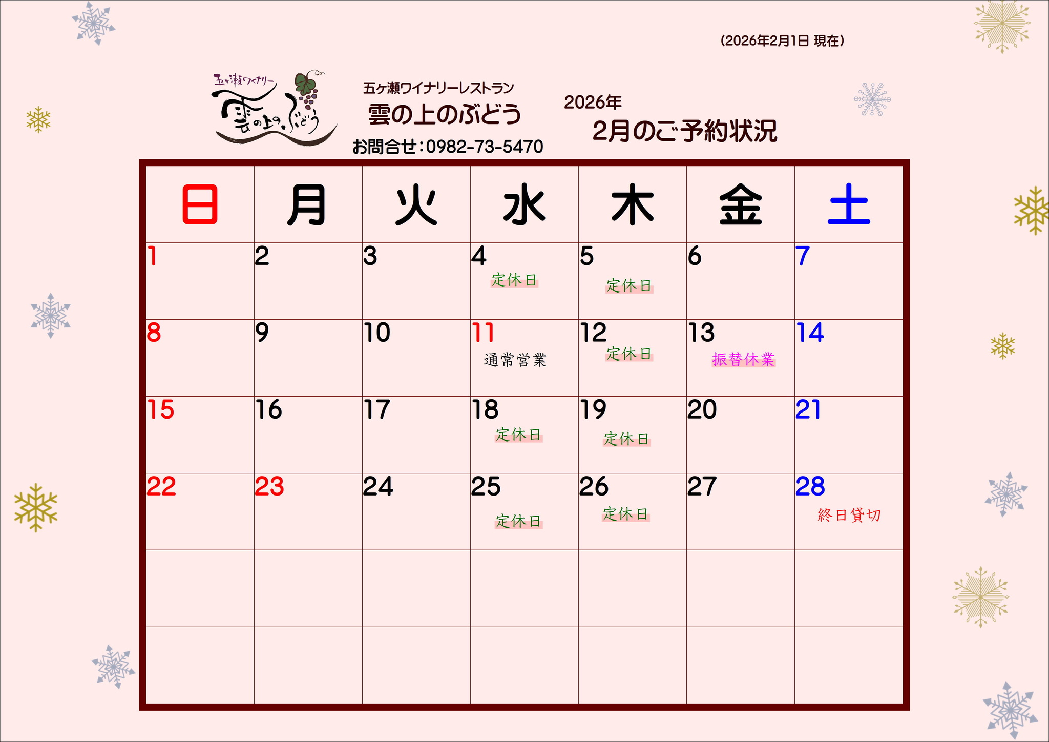 一覧へ戻る五ヶ瀬ワイナリーレストラン(雲の上のぶどう)2月カレンダー2026-02-01随時ご予約状況は変更になりますので、お気軽に 0982-73-5470 までお問い合わせくださいご来店を心よりお待ちしております✨五ヶ瀬ワイナリーレストラン 雲の上のぶどう