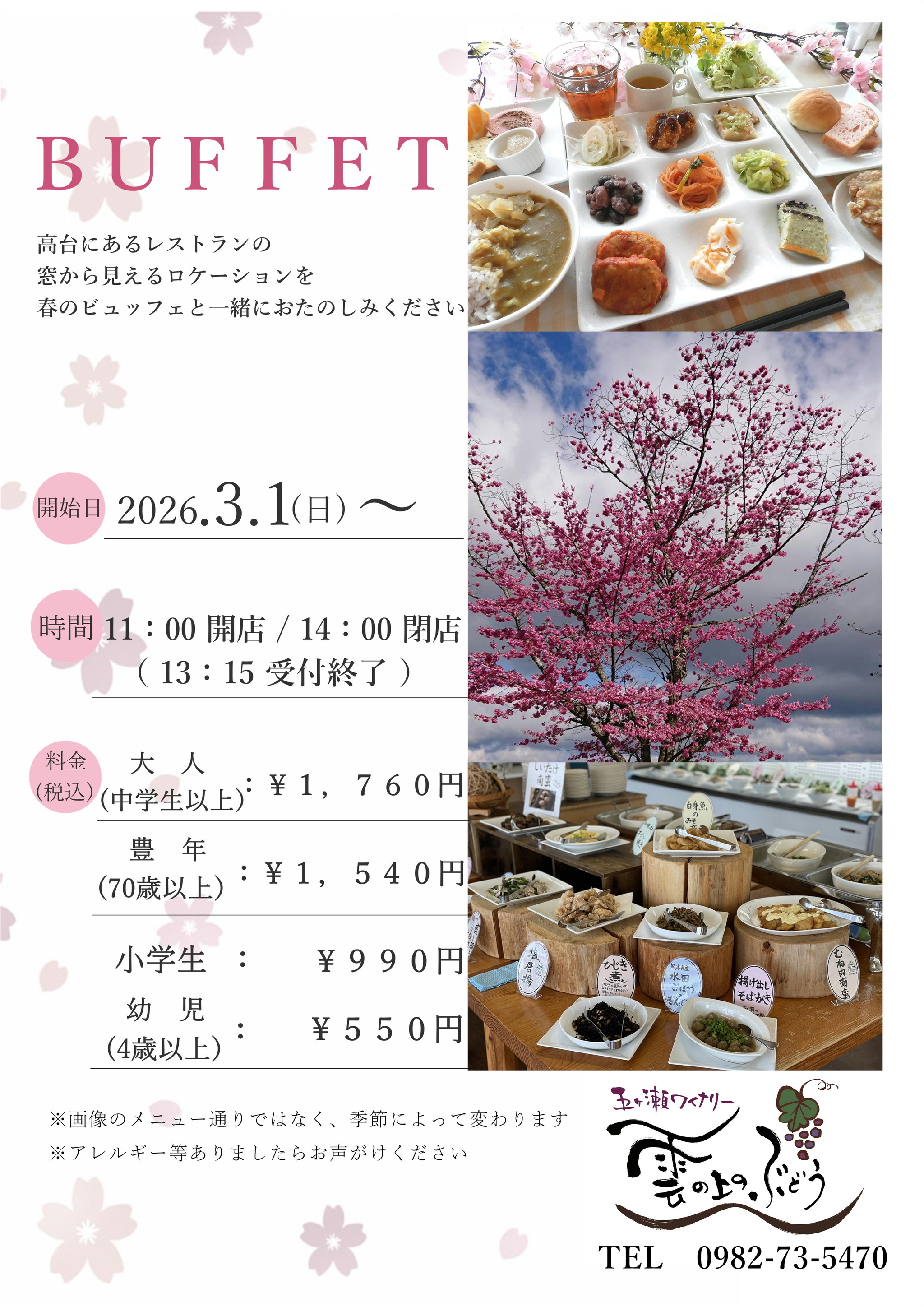 一覧へ戻るレストラン・雲の上のぶどう 3月1日~ビュッフェスタイルになります2026-03-01先日の投稿でお知らせした通り、料金および営業時間を改定させていただきます。何卒ご理解賜りますようお願い申し上げます。ご来店心よりお待ちしております